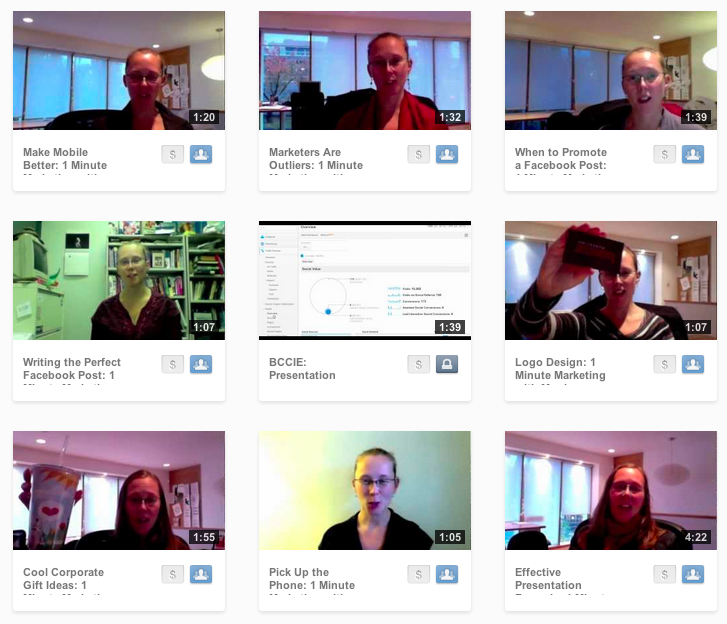 Each morning en route to the office, I would think of a 1-minute marketing tip to share (2-3 min). Using iMovie, I would then record the video in 1 take (launch app, record, export = 3-5 min). Then I would upload the video to YouTube (3-5 min). I have YouTube set up to auto-post to Twitter when a new video is loaded but I would manually share the link on Google+ and Facebook (1 min).