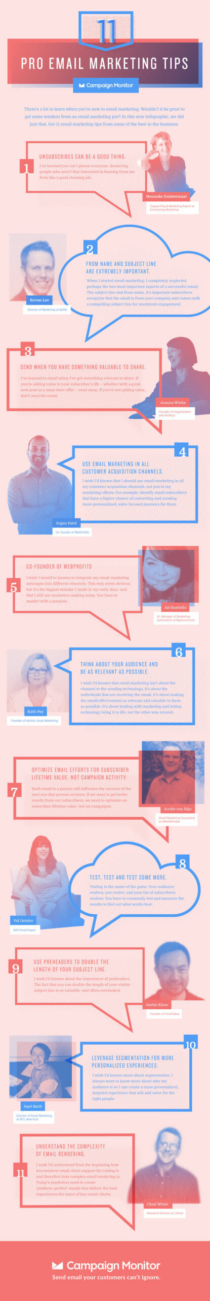 Campaign Monitor is one of my favourite services. I like that I can set up email marketing for clients and give different access permissions to different people depending on their role. I also find their blog and resources to be solid. This infographic is a recent edition. Let’s have a closer look at the tips.