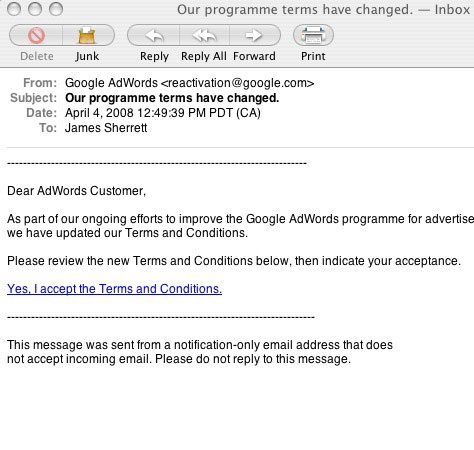 Late last week I received an email from Google AdWords at an email address that looked like reactivation@google.com. Except the email wasn’t from Google AdWords and the originating email address wasn’t really reactivation@google.com.