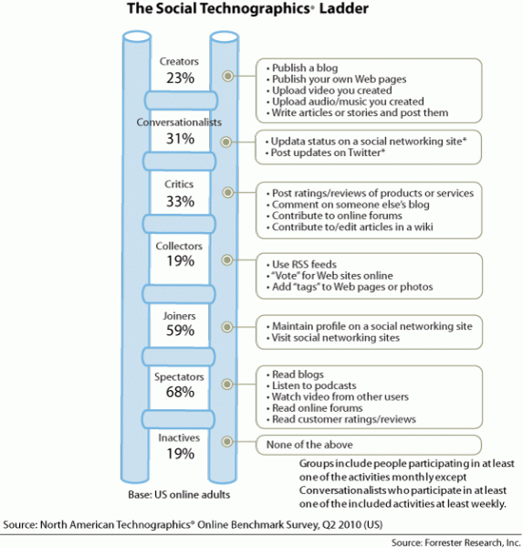 Compared to previous data, the Joiners group (social network participants) continues to grow yet the other categories are stable or declining. “For the first time, Spectators are down and Inactives are up. The declines are small and data is subject to margins of error, but it’s clear that we’ve at least reached a plateau.” (Source: Forrester)