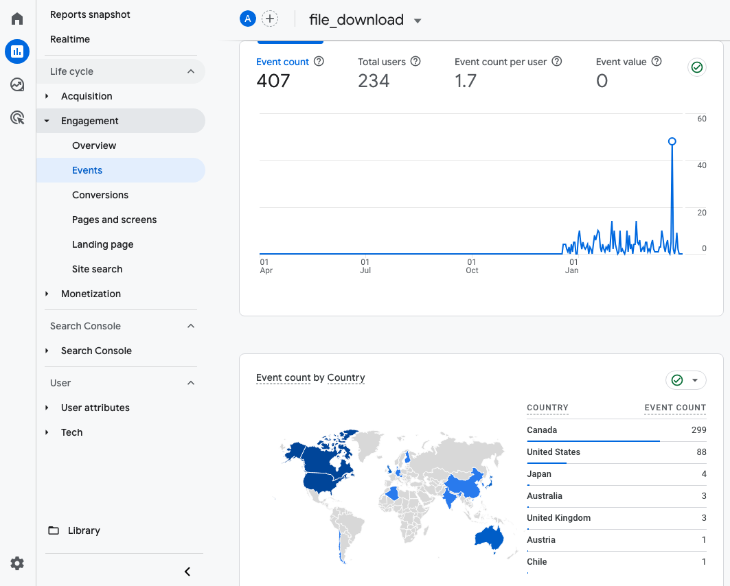 TIP: Go to the Events report and click the pencil icon in the top right to customize the report. For dimensions use File name and File extension, for metrics use Event count, Total users, and Event count per user. Save the customized report under a new name and then in the Library add it to the appropriate section so the report is viewable in the left nav. This tip assumes you are using GTM to send the file_download event, along with the relevant parameters.