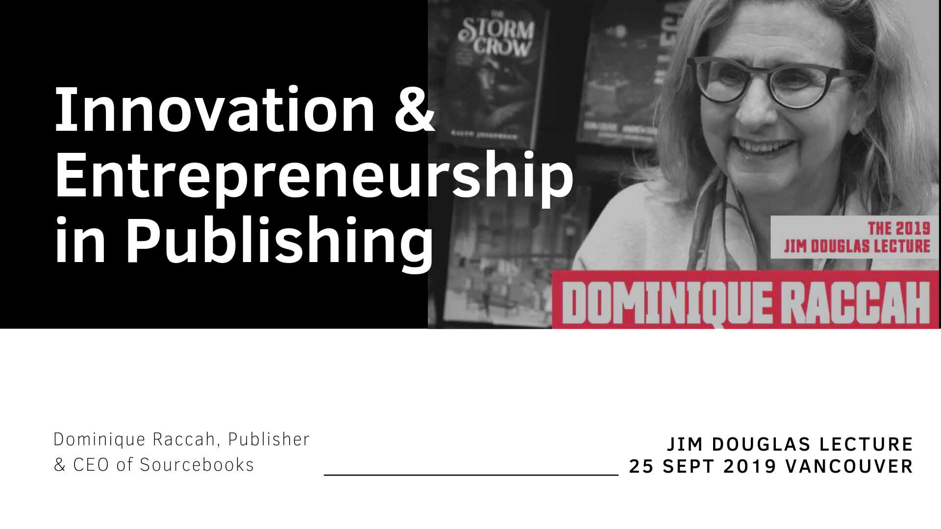 Dominique Raccah, awarding-winning Publisher and CEO of Sourcebooks, presented the 2019 Jim Douglas Lecturer on September 25, 2019 @ SFU Harbour Centre, Vancouver, BC. I had the good fortune of attending her talk and interviewing her the following day. This is my recap.