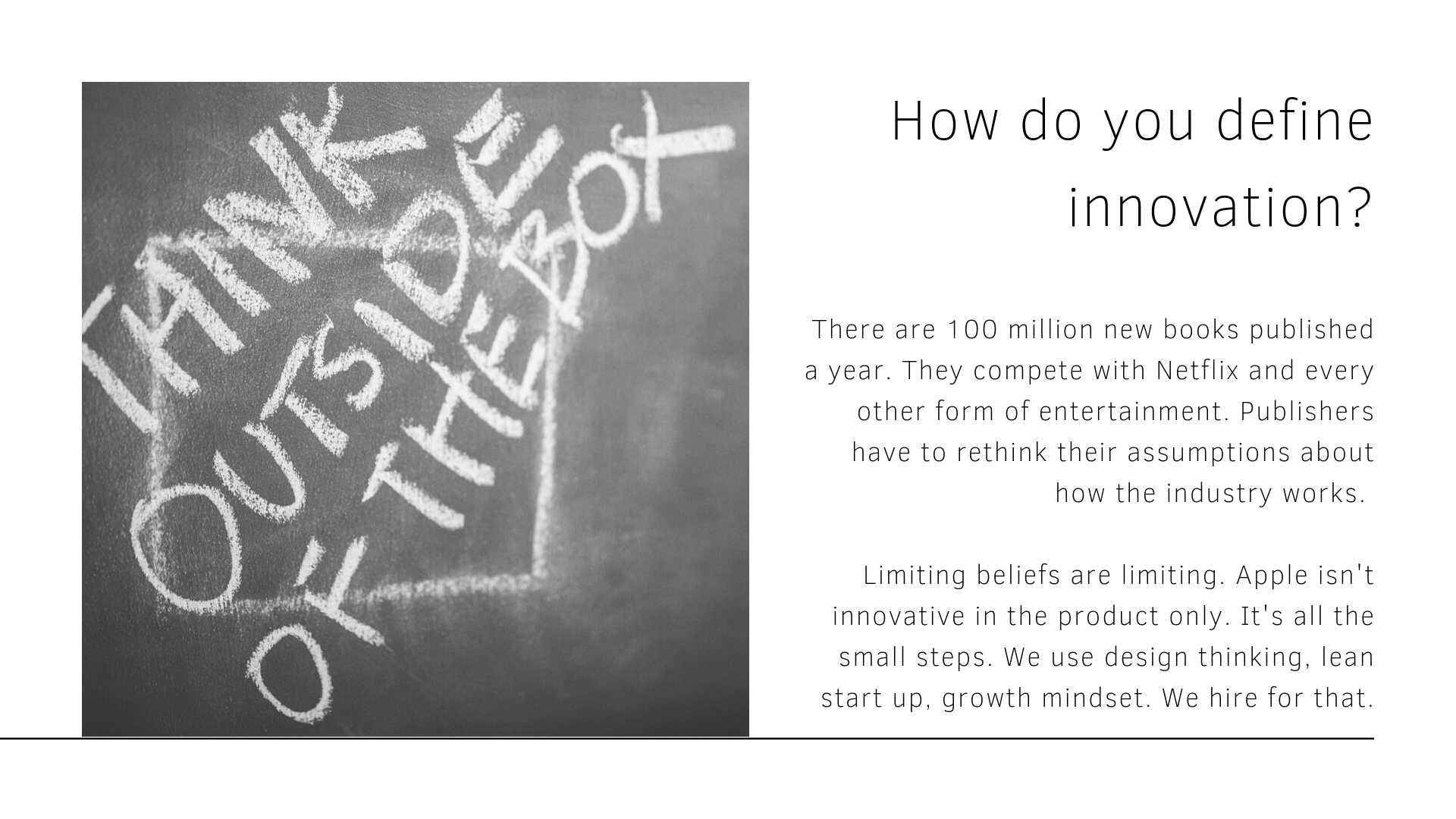 - In a world where all publishers are equivalent in the eyes of the consumer, how do you distinguish yourself? Author is the key differentiator. It is not the product. We don’t care about the format: ebook, book, app, whatever is next. Apple is more than the product, it’s the innovation in all the moments.