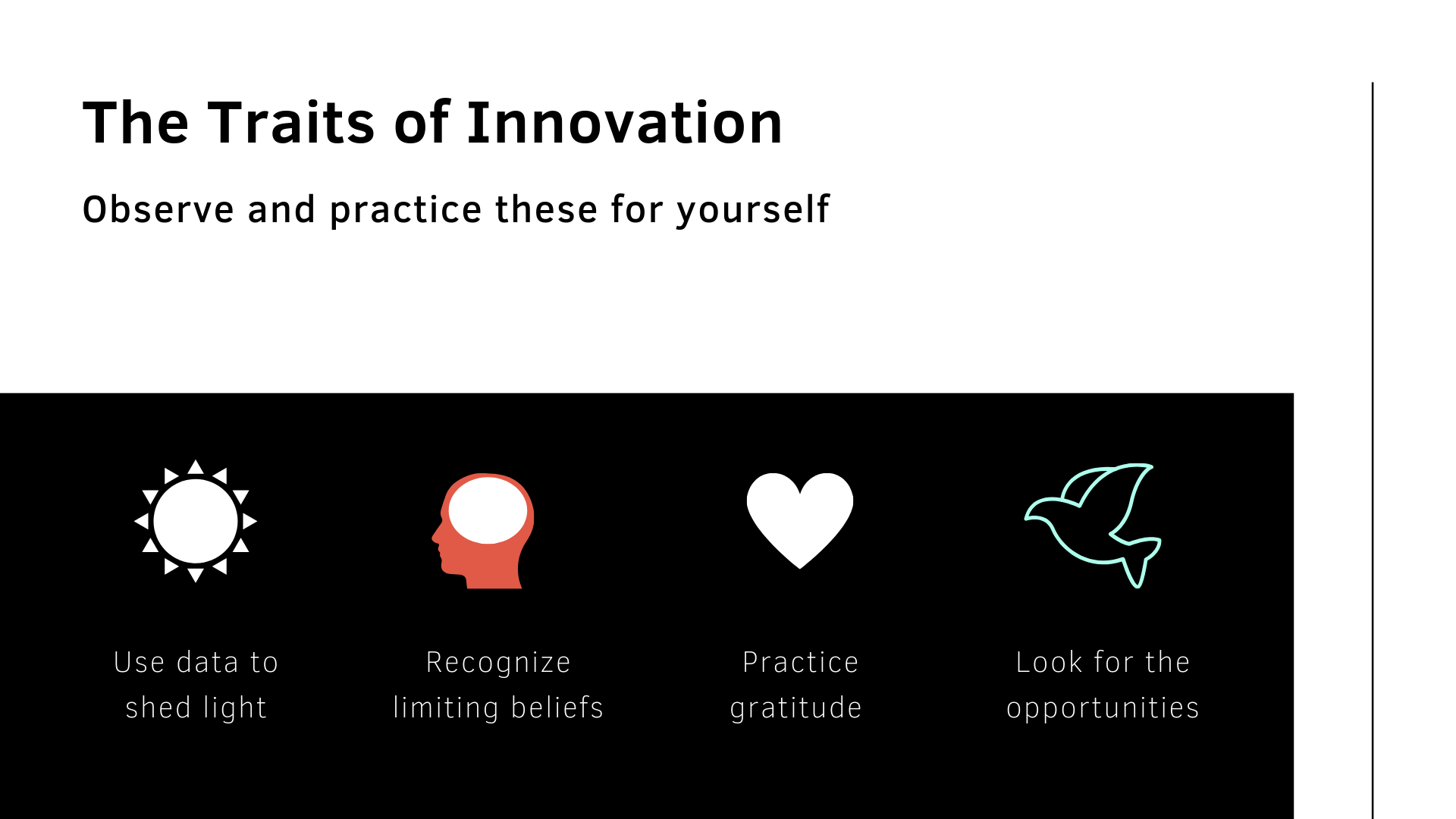 - Dominique says, “data is a creative weapon.” It should not be seen as limiting creativity but rather as a tool to understand the customer, to form questions and hypothesis with. Surveying people is not the approach. Ethnography is. Don’t depend on what people say they will do; watch what they actually do.
