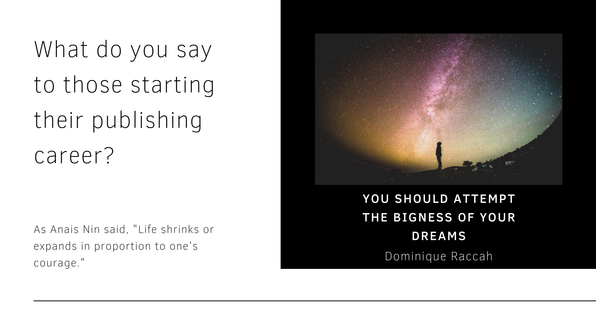 - Dominique works with a personal coach and a business coach. One day discussing a series of woes, her coach said, “you know what Dominique, your problems are not big enough.” She gave the same advice to me, which was an echo of what she said at the end of her talk.