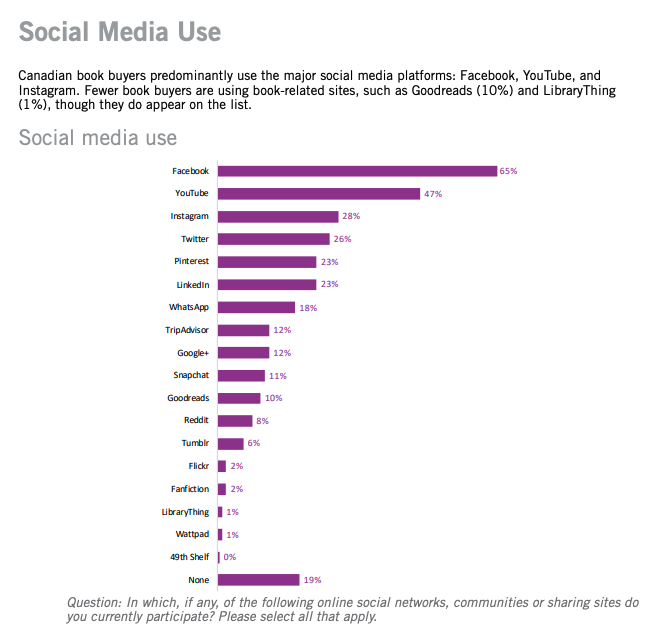 And it’s not “other people” using Facebook. Facebook is the top-reported social network used by Canadian book buyers, according to BNC’s “The Canadian Book Buyer 2018.”