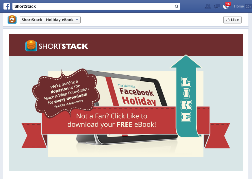 You could also add a Like-Gate to a Facebook tab for something related to holidays. Shortstack, for example, is offering a free download of their Holiday Ideas eBook in exchange for a LIKE on Facebook. They are also making a charitable donation to Make a Wish Foundation for every download.