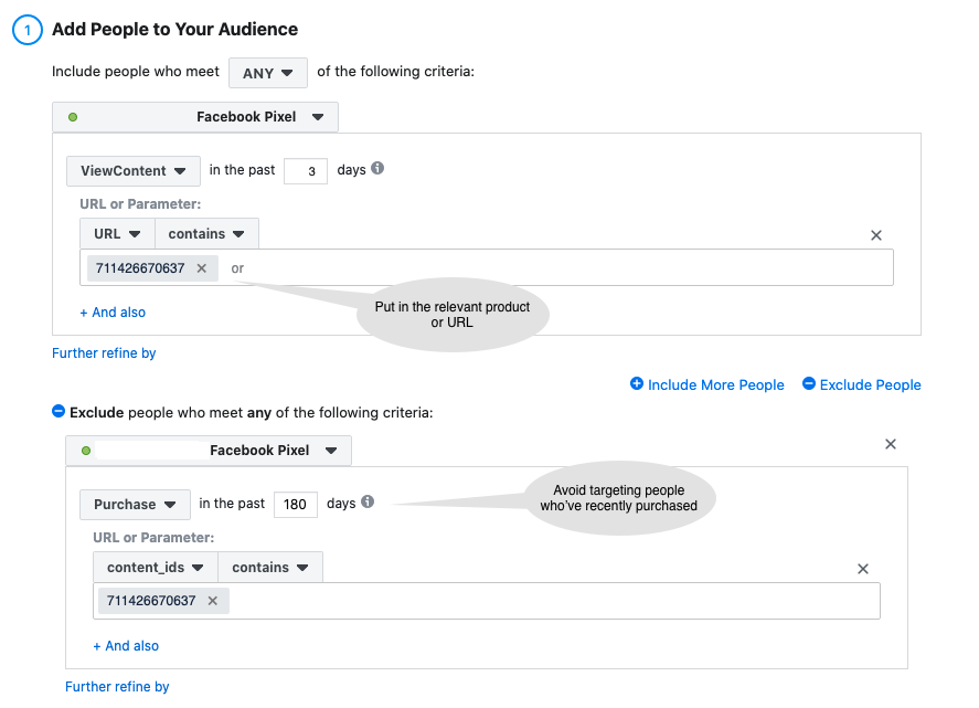 In this example, we will retarget people who visited the product page recently (in the past 3 days) but exclude people who purchased the product in the past 180 days.