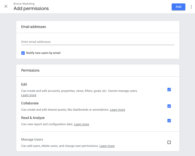 3. Click Add to finalize the process. The new user can now log in to Analytics and access your Google Analytics data.
