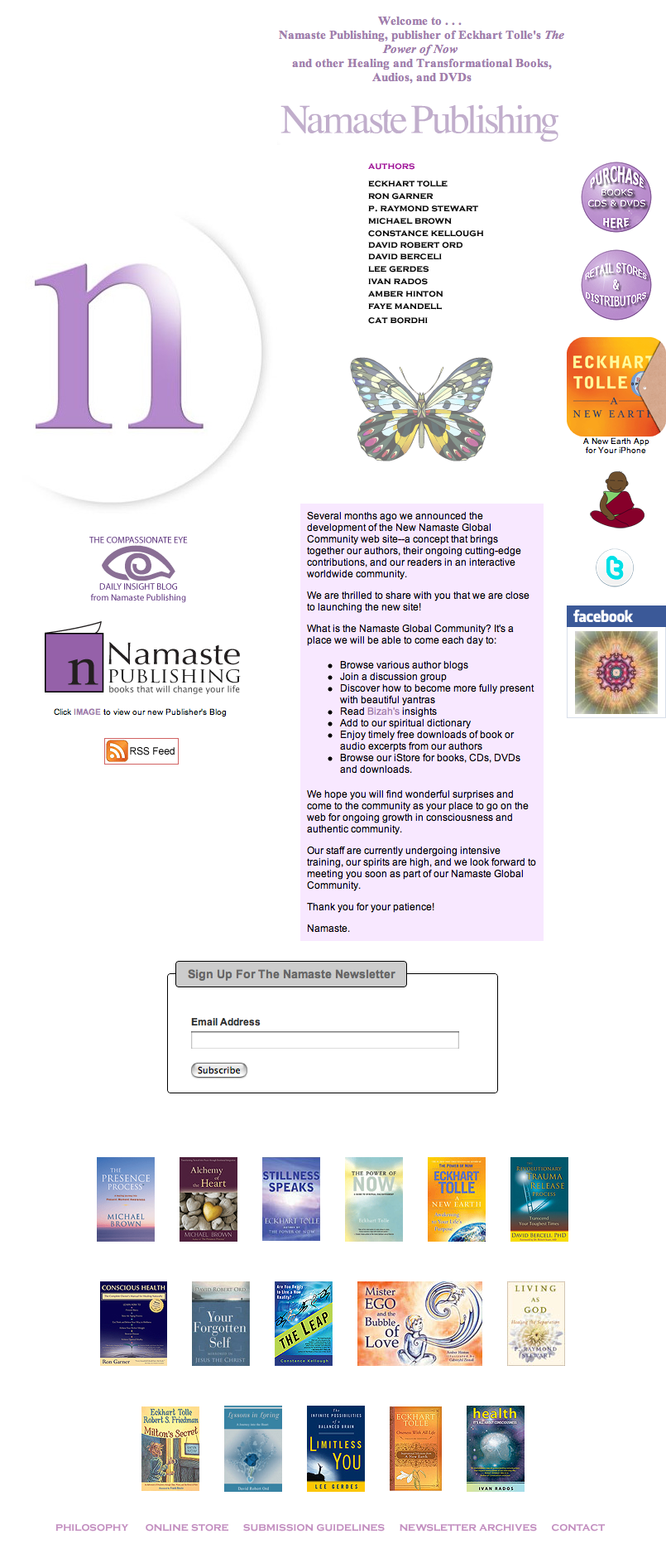 Namaste Publishing and Boxcar Marketing worked with Todd Sieling of Corvus Consulting on the information architecture, user experience, and interface design. Key to this phase, and taking the design lead, was Lift Studios, who provided the brand redesign (logos, business cards and other identity) and worked closely with us on the website redesign and desired user experience.