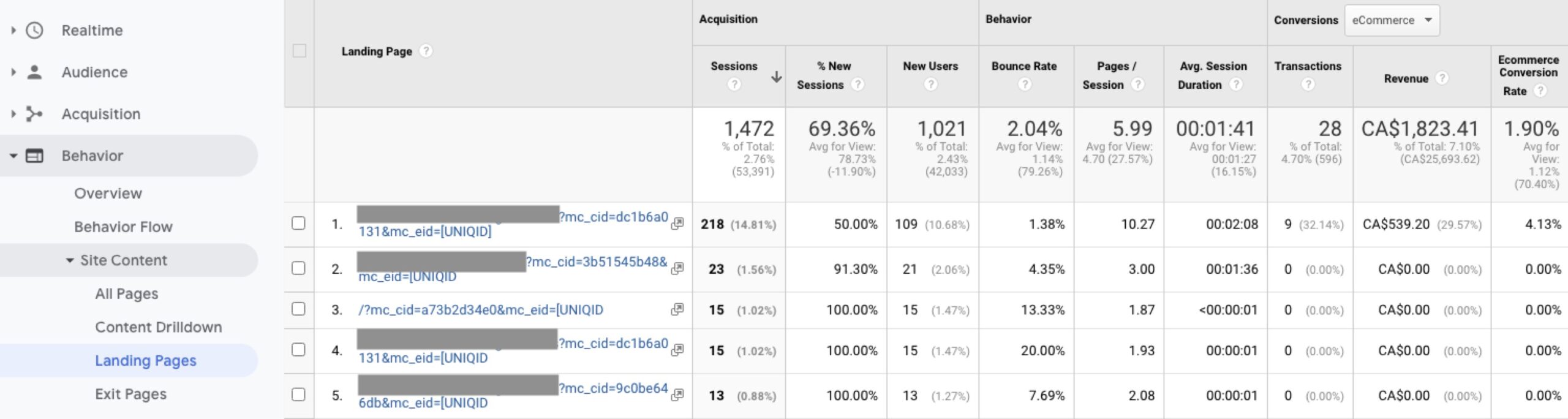 Click tracking parameters like mc_cid and mc_eid from Mailchimp and fbclid from Facebook ads confuse Google Analytics into thinking that one landing page is actually many. Each URL appears different because of the unique tracking parameters Mailchimp adds to the URL to track subscriber click behaviour.