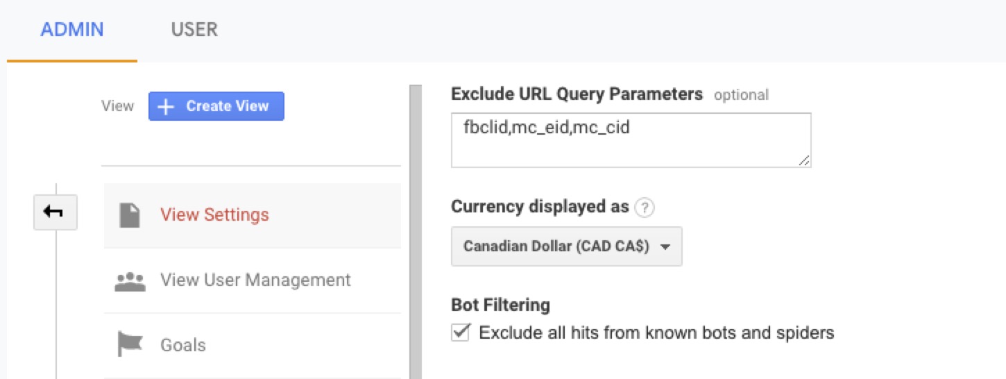 To fix the issue, log into Google Analytics and edit the View Settings in Admin. Add the mc_cid and mc_eid parameters in the “Exclude Query Parameter” box, and also include the Facebook tracking parameter (comma separated). It will look like this: