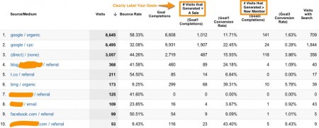 I call this my “What Does Success Look Like” Report because it quickly tells me what channels generate the most conversions and the most valuable conversions, as well as the conversion rate, and the bounce rate for my various marketing channels. You can see in the example report that the Goal Completions number only tells part of the story, whereas Goal Completions + the Goal Conversion Rate provide greater insight into which channels could be better leveraged.