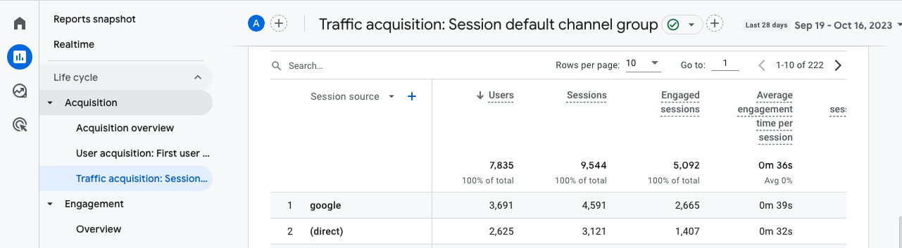 - Session source appears in the Traffic acquisition report and indicates the first traffic source for a visitor during a 30-min window of activity. This is a session-scope dimension and can cause some confusion. If a visitor arrives via a Facebook post then within 30 min also clicks on a paid search ad, only Facebook is given the credit for the session. So if you are thinking that your ad traffic is not matching what you see on the site, then it may be a result of visitors having multi-touch sessions and only the first touch is given credit. If the activity happens more than 30 min apart, then that is two session and two sources will be reported.