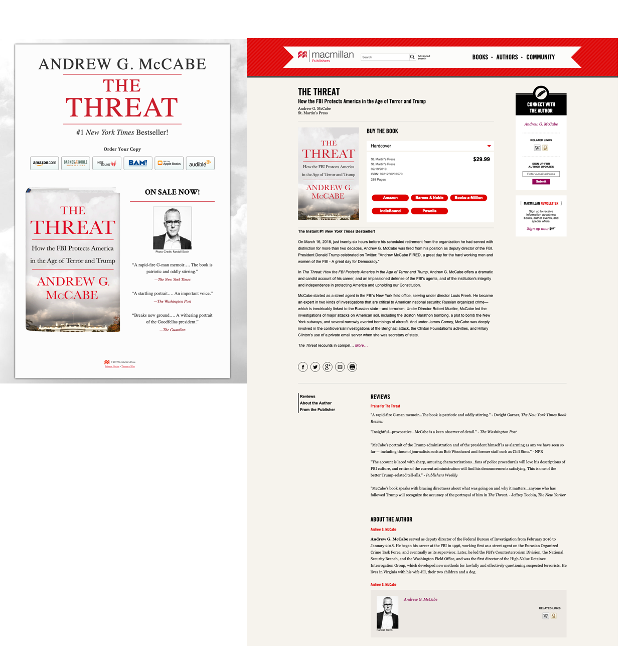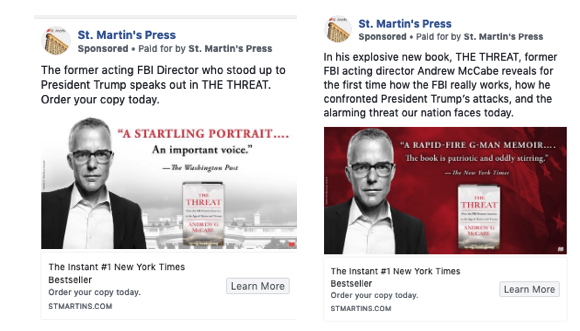 St. Martin’s Press ran Facebook Ads for The Threat by former acting FBI Director Andrew G. McCabe. They A/B tested different ad options: red vs. white image, New York Times quote vs. Washington Post quote, different descriptive text, etc.
