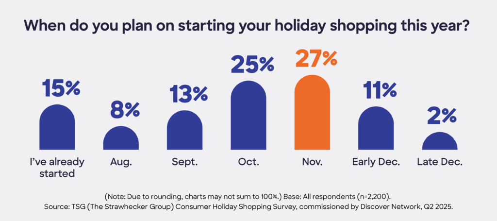 The data confirms this trend: a recent consumer survey revealed that more 63% of shoppers plan to do most of their holiday shopping mid-to-late fall (October to early December), with a significant 25% starting before the end of October.