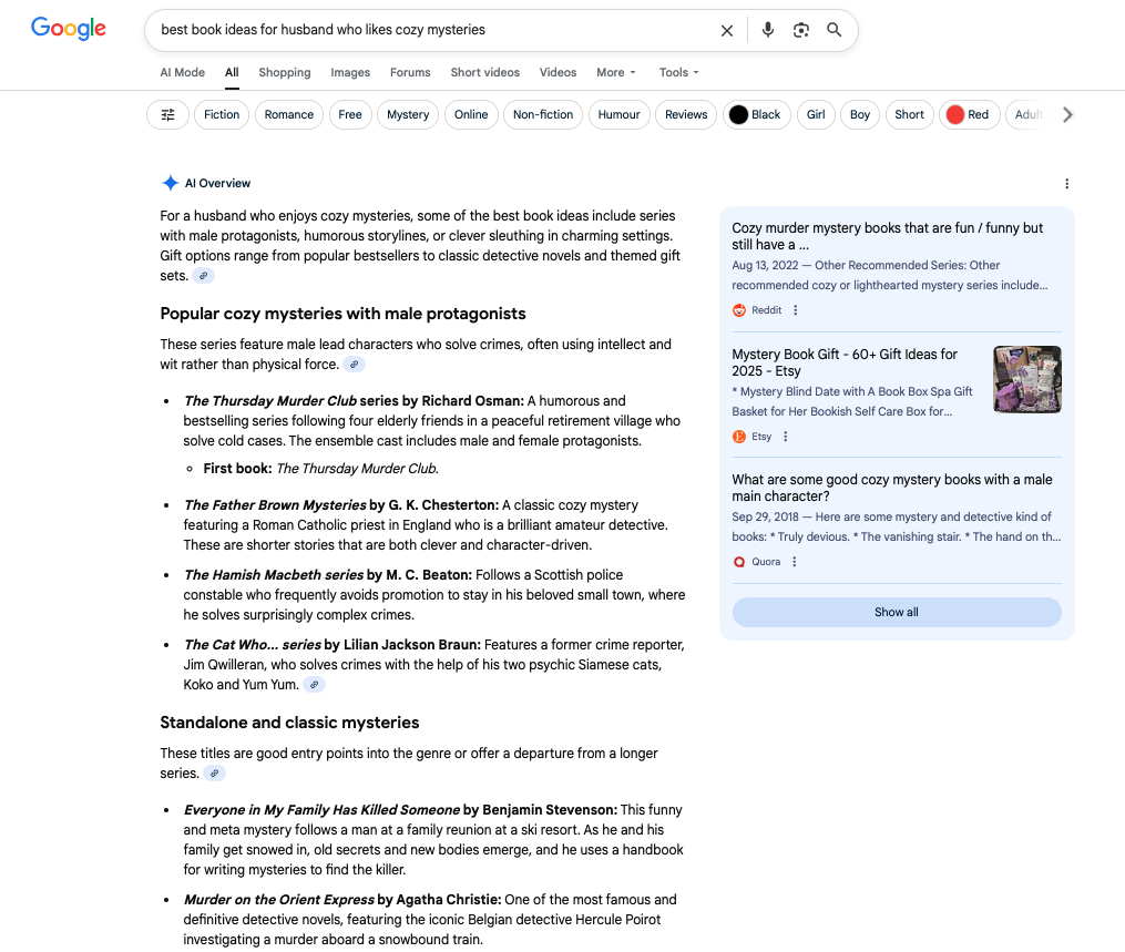 Here’s a look at the AI Overview for “best book ideas for husband who likes cozy mysteries.”